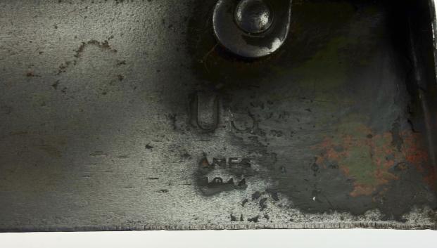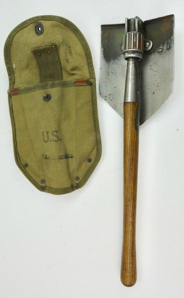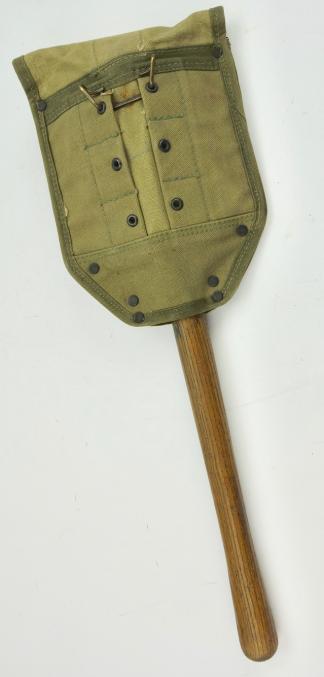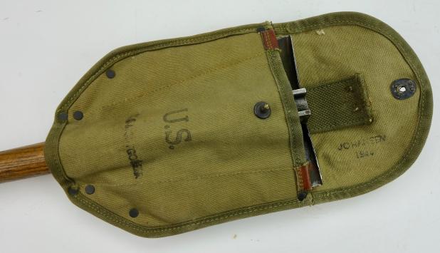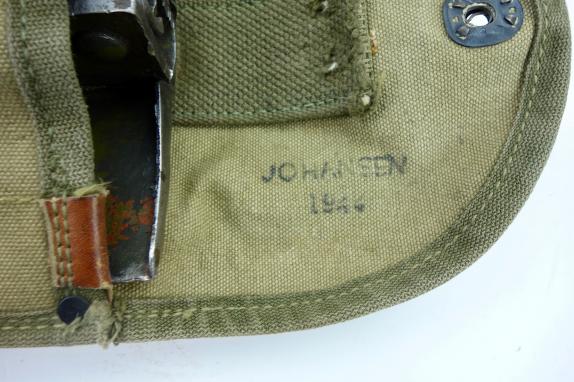 Nice early US WW2 folding shovel cover made by “Johansen” and dated “1944” and name stamped with the GI’s name, complete with a nice used US WW2 folding shovel, made by “Ames” and dated “1944”