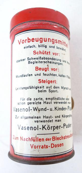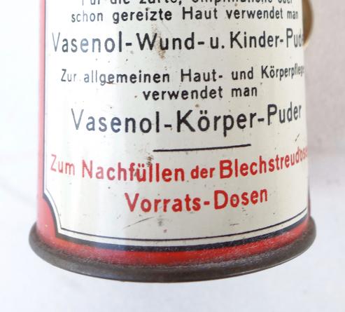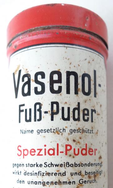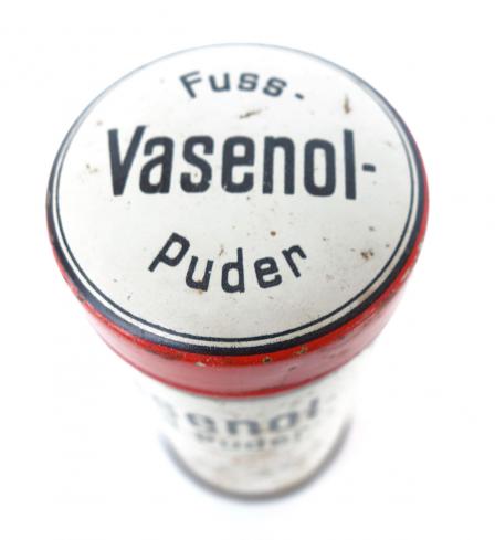 Wehrmacht Foot Powder "Vasenol" Original metal can with content of "Vasenol" foot powder Made by "Vasenol-Werke Dr. Arthur Koppf, Leipzig" In good condition!