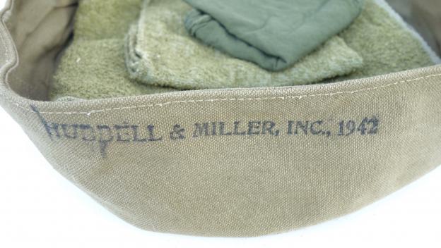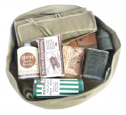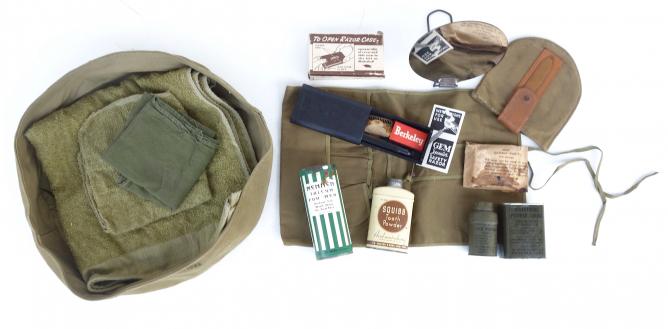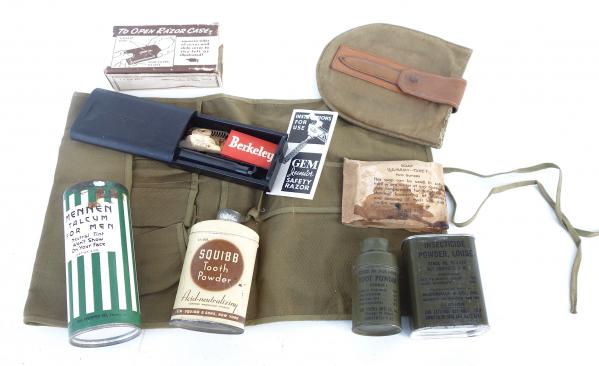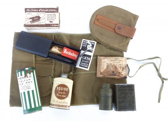 Folding washing bowl, towl, wash towl, handkerchief, toilet role, shaving mirror in cover, GEM razor in case, soap in packaging, foot powder, lice powder, talcom, aquibb tooth powder. All in used but very good condition. Very nice for display!