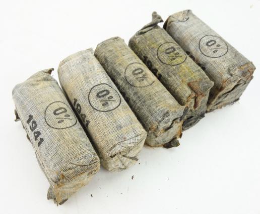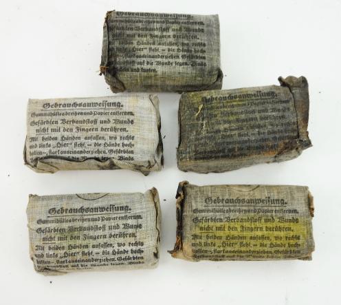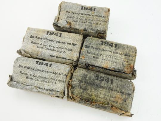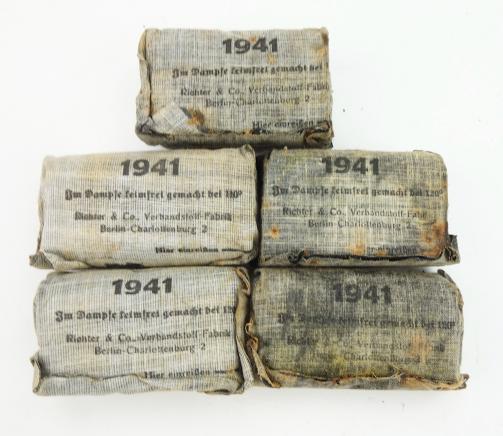 5 Wehrmacht First Aid Wound Bandages All same maker and all dated “1941” All made by “Richter & Co, Verbandstoff-Fabrik, Berlin-Charlottenburg 2” in good condition.