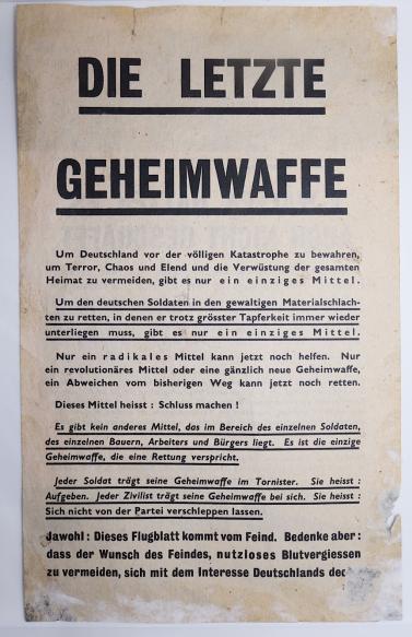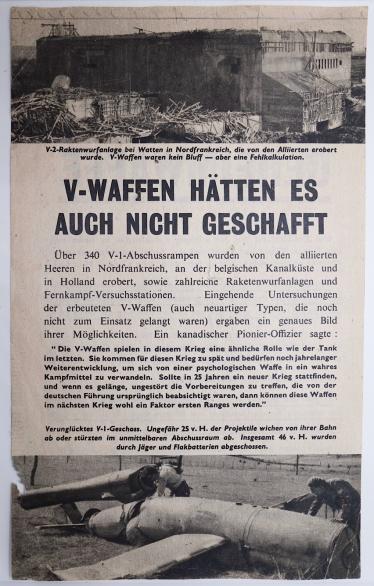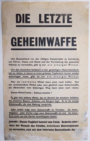 Allied Propaganda Flyer About Hitlers Secret Weapons “Die letzte Geheimwaffe” Allied flyer telling the uselessness of Hitlers secret weapons. Nice rare flyer in very good condition.
