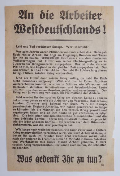 Nice used Allied Propaganda Flyer about Bombs at the Ruhr to the factory workers in West Germany who work in the factory which “Hermann Göring” made the promesse not a single Allied bomb would be dropped on the Ruhr territory. (Hard of the German Industry)