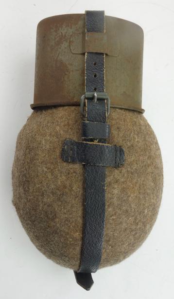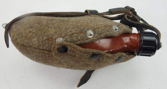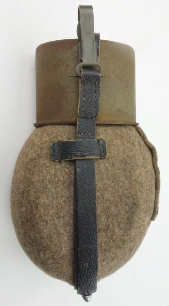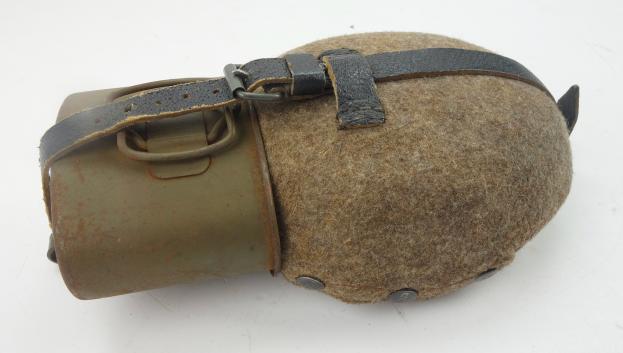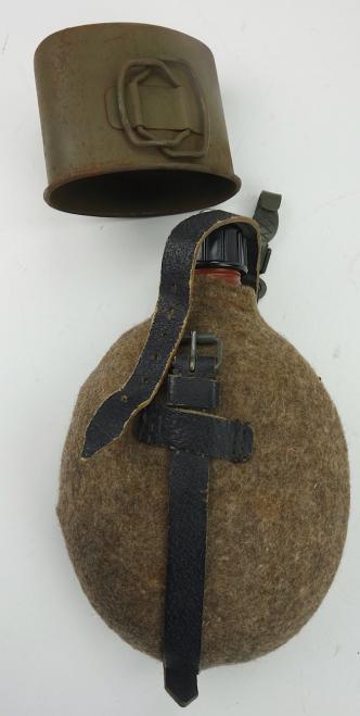 The canteen is a nice metal made one with the red finish. Complete with a very nice cover without moth or other damage. Overal a very nice late war Wehrmacht M31 canteen in used but very good condition.