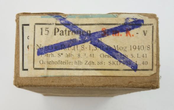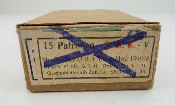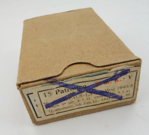 Very nice Wehrmacht Clipboard K98 Ammo Box (empty) marked “Patr. S.m.K” (Schwere Spits Geschoss mit Kern) “full metal jacket” these boxes, would hold 15 rounds in total. 4 boxes are two K98 pouches full, Overal nice box in used but good condition.