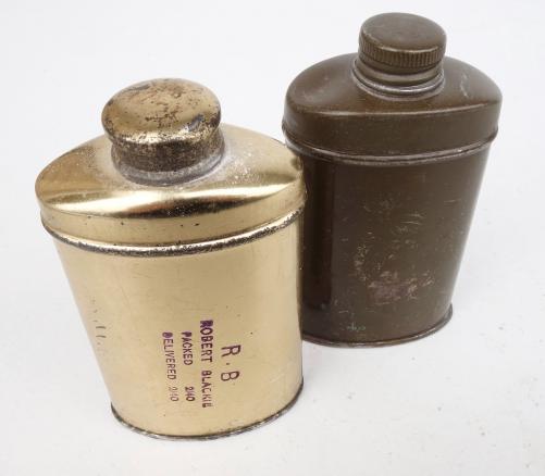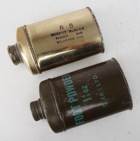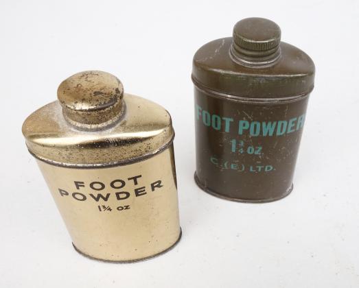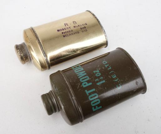 British WW2 Foot Powder Two metal cans of British WW2 Foot Powder Maker marked and with original content. In very good condition.