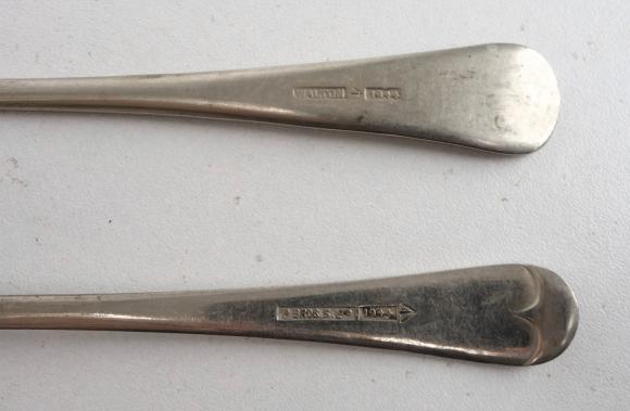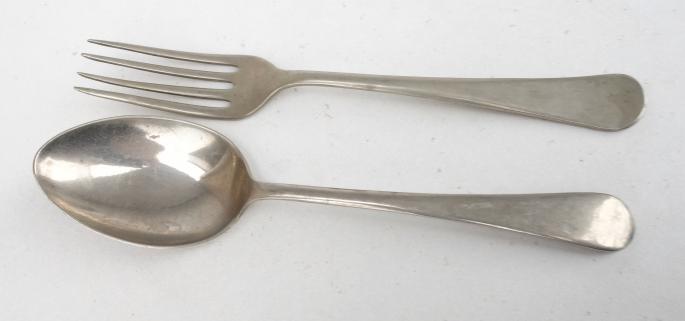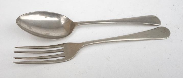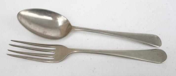 British WW2 Spoon and Fork Nice British WW2 Spoon and Fork set. Both maker marked and dated “1944” And both marked with the British army broad arrow sign. In used but very good condition.