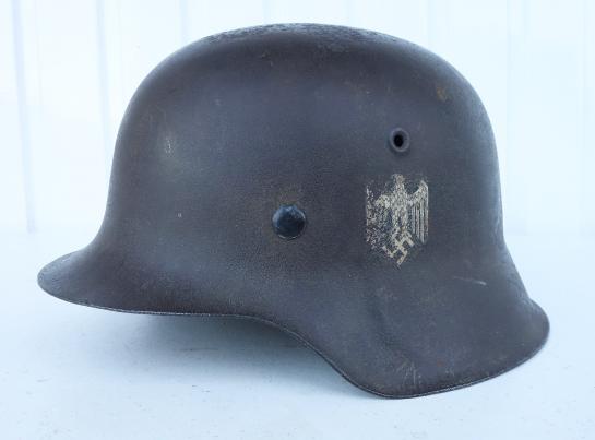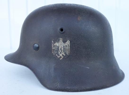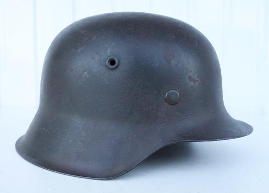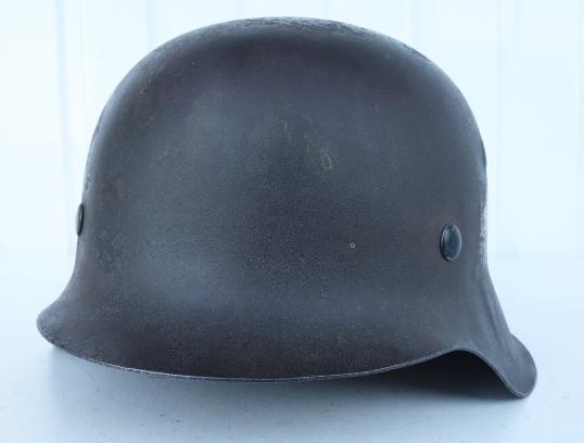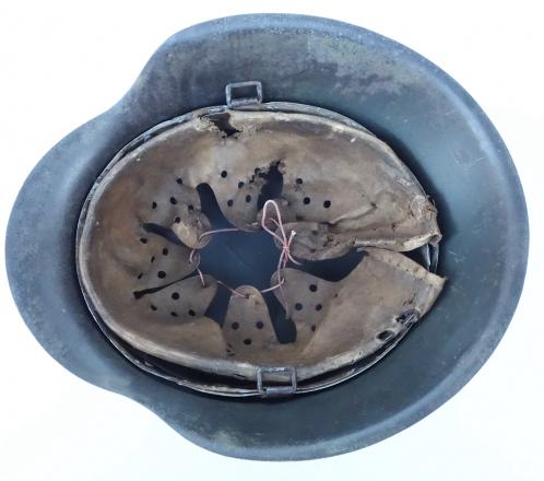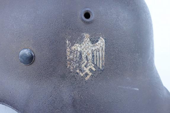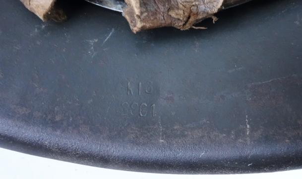 Maker code marked “CKL” which is “Eisenhuttenwerk AG, Thale Harz” in steelpot size “64” in 85/90% of its original camo paint. The “Wehrmacht Heer” decal is in 80%. The helmet is complete with its original salty liner in size “56/57” overal a nice salty M42 SD Wehrmacht helmet in used but good condition for a nice price!