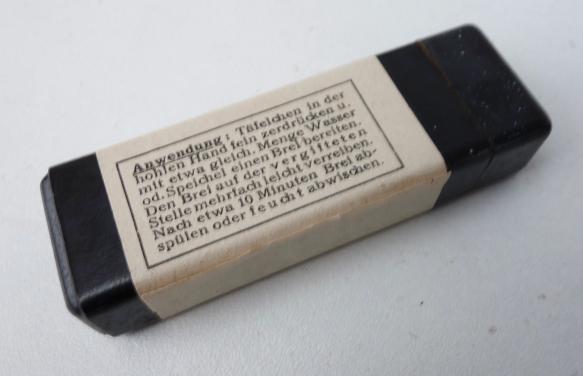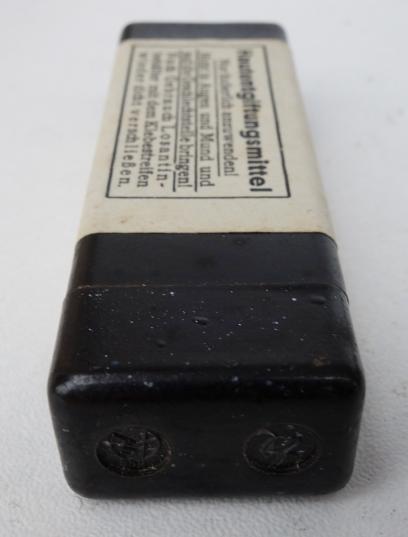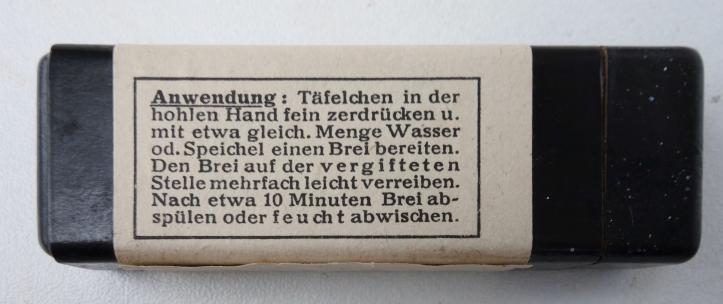 Wehrmacht Ointment Tablets (Hautentgiftungs) Nice bakelite little box (empty) with original paper instruction label. Belongs in every Wehrmacht gasmask cannister. In very good condition.