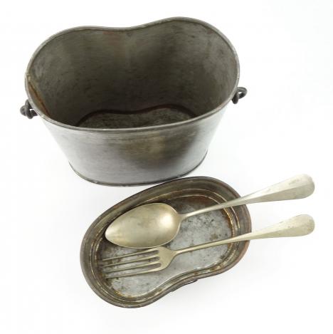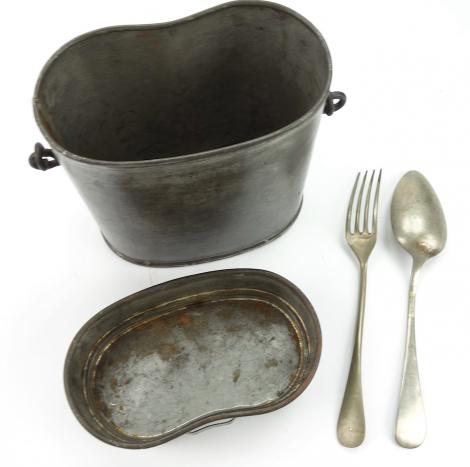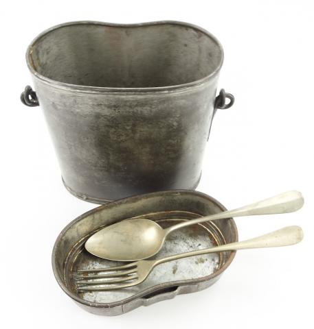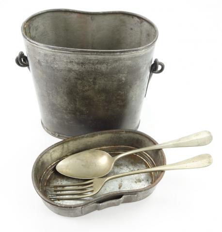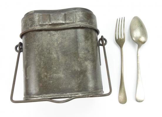 Dutch WW2 Mestin and Fork and Spoon set Nice used Dutch WW2 Mestin and Fork and Spoon set which was carried in the mestin pouch. In used but good condition.