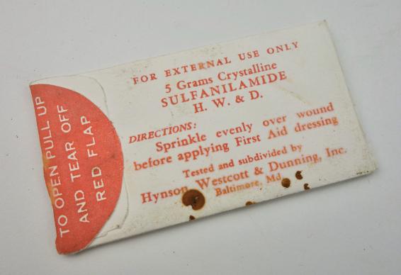 US WW2 Medical Sulfanilamide Packaging Nice package with content of US WW2 Medical “Sulfanilamide“ which was used to stop bleeding of combat wounds. In good condition.