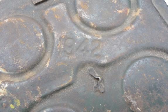 Very nice British WW2 25 Ponder Shell Box, “1942” dated. With original inside frame and 8x war time dated 25 Ponder shells. In 85% original camo paint and text and inside original paper label.