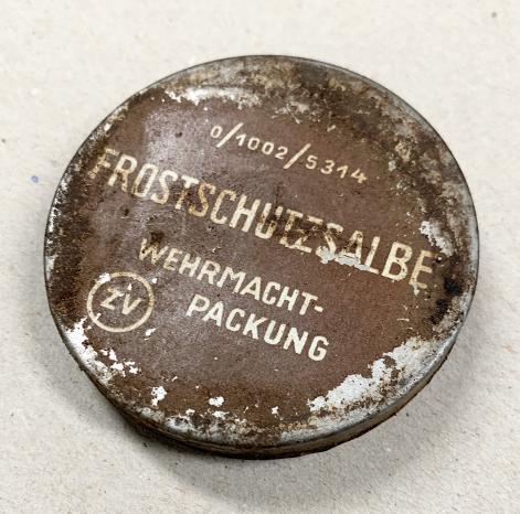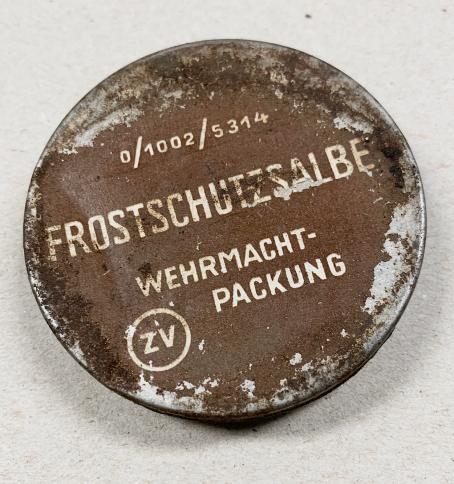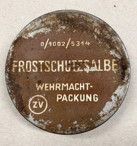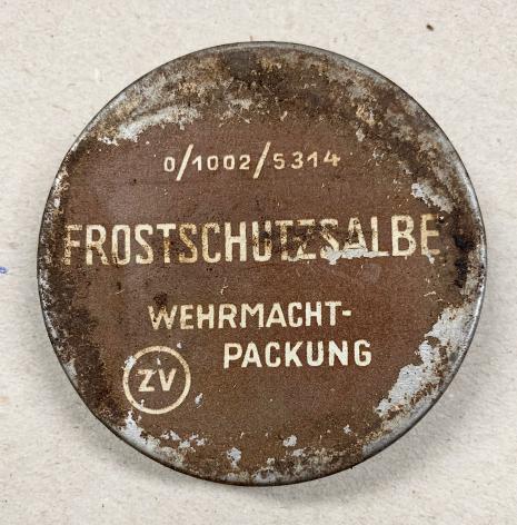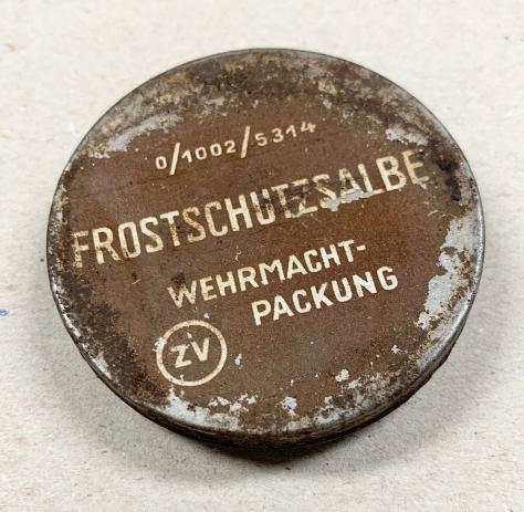 Nice original metal can Wehrmacht “Frostschutz Salbe” skin ointment to protect the skin against ice cold and freezing weather. Nicely marked “Wehrmacht Packung” nice used metal can with content in good condition.
