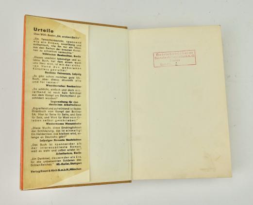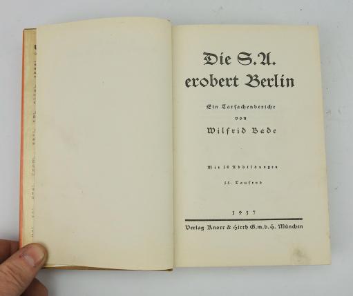 SA Book “Die SA Erobert Berlin” Very nice early Third Reich book, dated “1937” Written by “Wilfrid Baden” with original paper cover Nice book in very good condition.