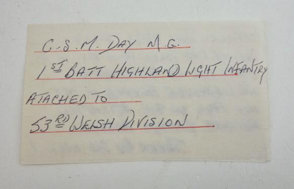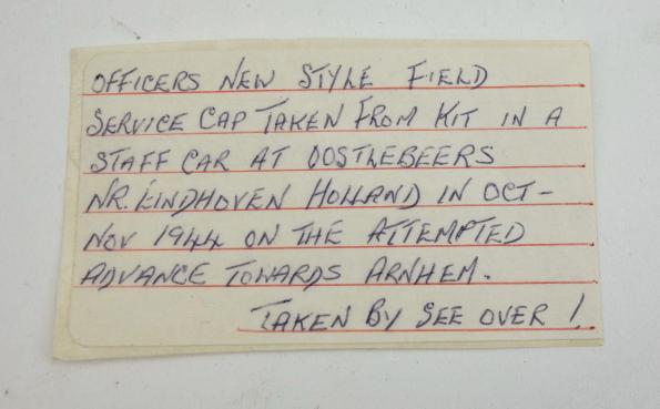 British vet bring back Wehrmacht Artillery Officers Field Service Cap. Very nice tailor made wool fiekd service cal with original sewed Bevo flatwire eagle and embroidered cocade. Very nice used cap taken by “C.S.Day” a vetran of the “1th Battalion Highland Light Infantry, atached to the 53rd Welsh Division” from a Wehrmacht Staff car in Holland in the village “Oostelbeers” near “Eindhoven” Oktober/November “1944” on the attempt advance rowards “Arnhem”