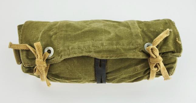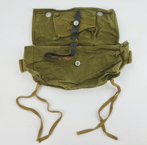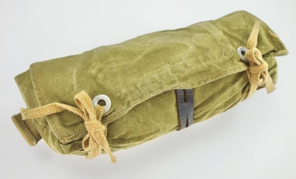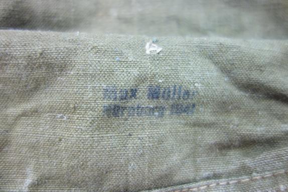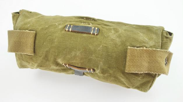 Very nice assault frame pouch, with tropical straps Maker marked “Max Mollo, Nürnberg” and “1941” dated. The Pouch was used to carry K98 cleaning kit and personel items and was attached to the assault frame. In nice used condition.