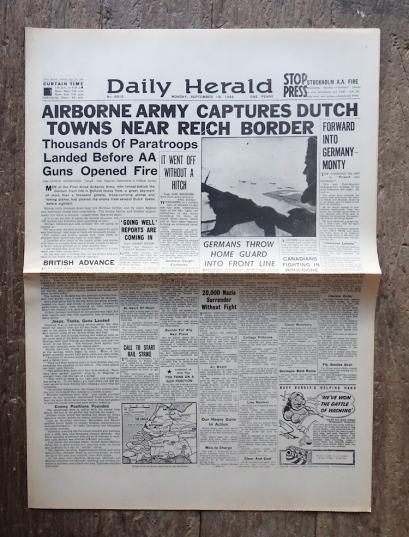 British WW2 News Paper Very nice wartime British WW2 news paper “Daily Herald” with headline “Airborne Army Captures Dutch Towns near Reichs Border” Dated September 18 “1944” In very good condition.