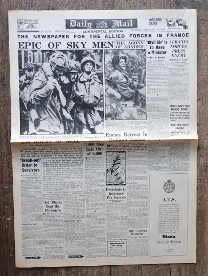 British WW2 News Paper Very nice wartime British WW2 news paper “Daily Mail” with headline “Epic of Sky Men” (The Agony of Arnhem) Dated September 28 “1944” In very good condition.