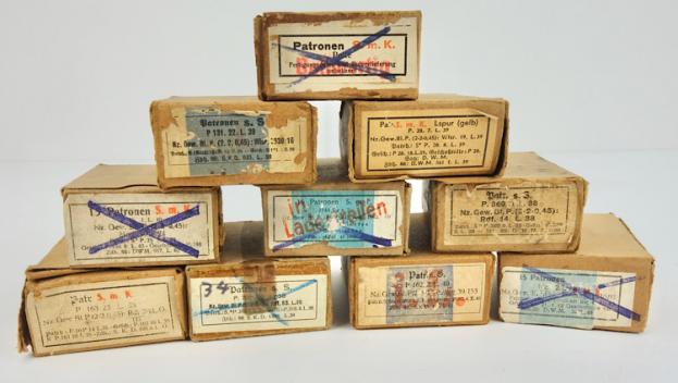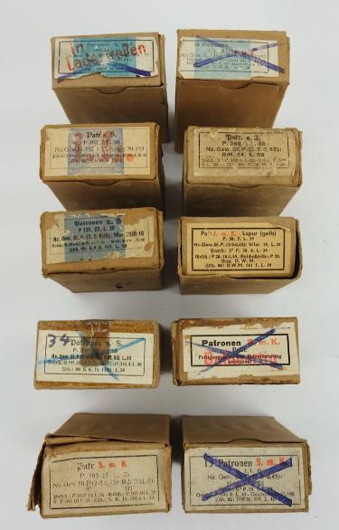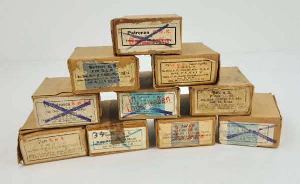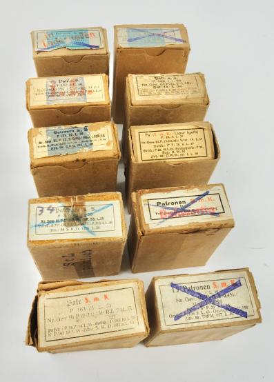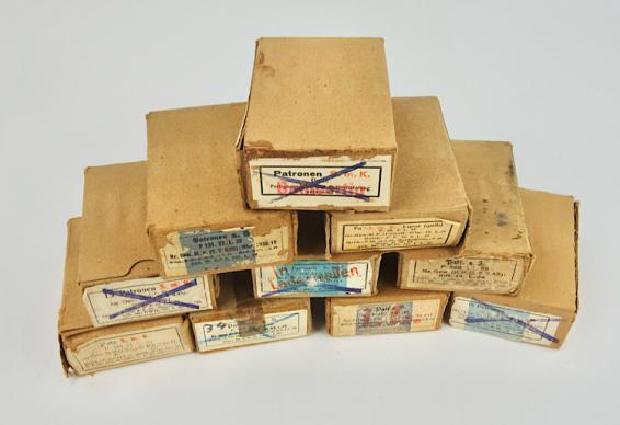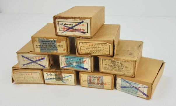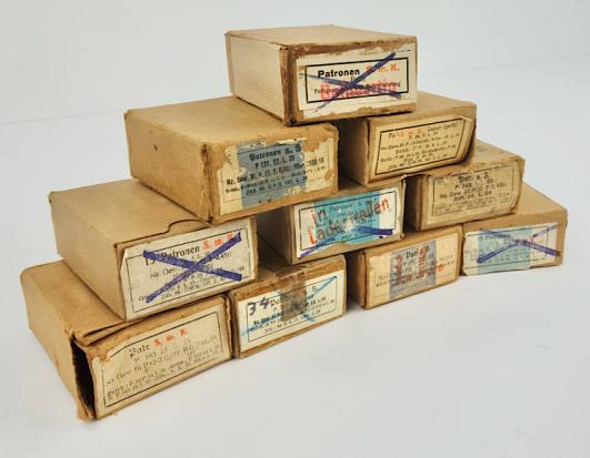 10 Cardboard K98 Ammo Boxes Nice used decorative cardboard boxes for 15 rounds each of Cal. 8x57mm K98 rifle ammunition All with original content labels. All in used but good condition.