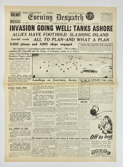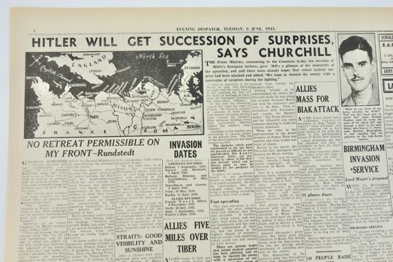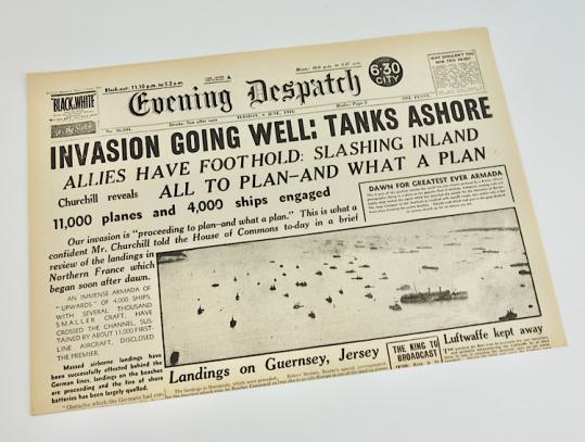 British WW2 News Paper Very nice wartime British WW2 news paper “Evening Despatch” with headline “Invasion Going Well, Tanks Ashore” Dated Juni 6 “1944” In very good condition.