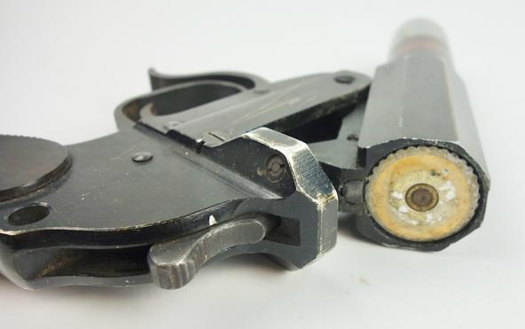 The firing Pin is missing and one bolt is replaced by a piece of wood. The flaregun closing spring does not work very well. Overal I nice flaregun for display.