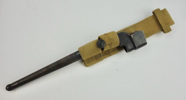 British WW2 Spike Bajonet with Webbing Frog Nice used British WW2 spike bajonet with nice “1943” dated webbing bajonet frog. In very good condition.