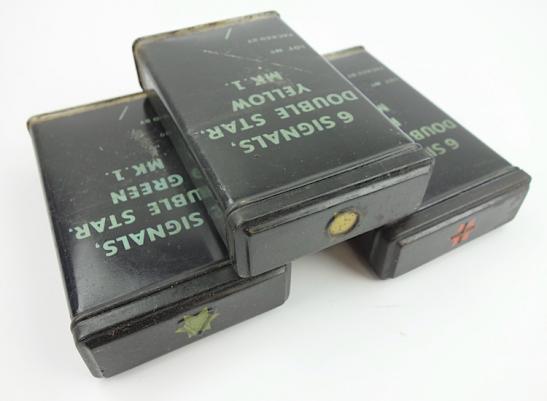3 British WW2 Flare Containers One container for red flares, one for yellow flares, one for green flares 6 flares in every container, dated May 1945 In very good condition