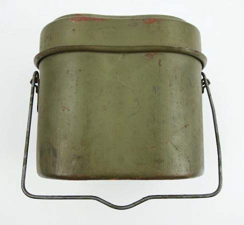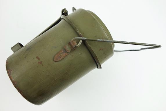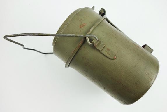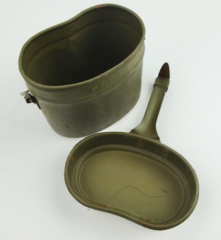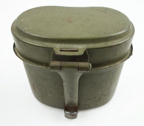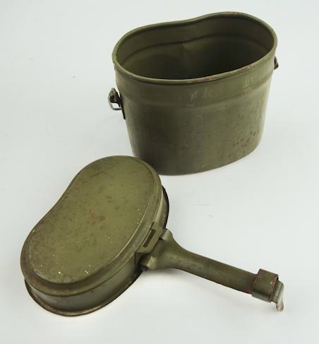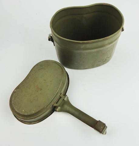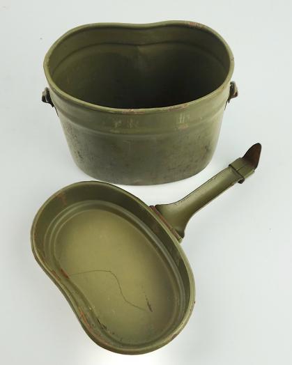 Wehrmacht steel M31 Mestin Very nice late war steel Wehrmacht M31 mestin "Kochgeschirr" "1944" dated in 98% of its original camo paint. With nice factory markings. In very good condition.