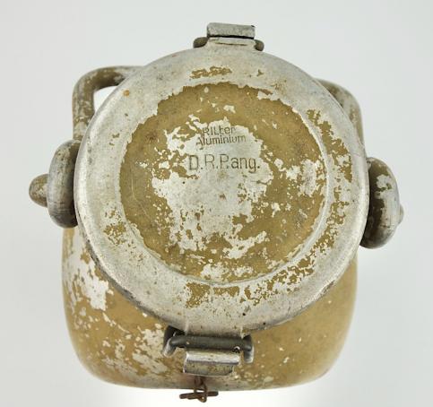 Very nice used Deutsches Afrika Korps 5 liter drinking water can. Nicely marked with its original text “Trinkwasser 5 Liter” in 90% of its original tropical camo paint. Maker marked “Ritter Aluminum” and “DR Patent”, but hard to read! Overal a very nice original DAK water can in used but good condition.