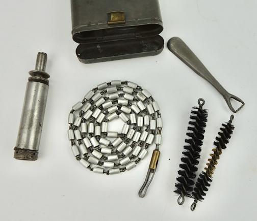 Wehrmacht K98 Cleaning Kit "Reinigungs gerät 34" Nice K98 cleaning kit, complete with a steel oil can, both brushes, tool and the chain, the small section is for cleaning cloth. Overal in very good condition.