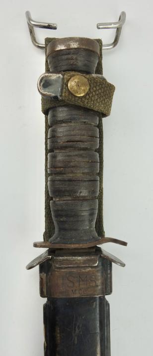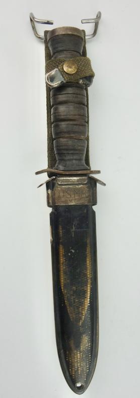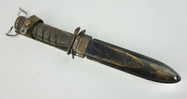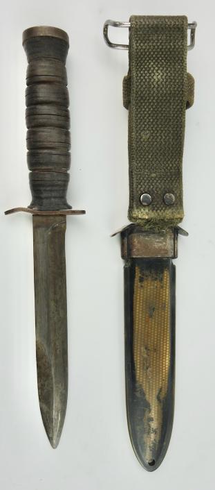 US WW2 M3 Combat Knife Used but nice US WW2 M3 combat knife 3th model marked but removed from the crossguard With its original US M8 scabbard. In used condition.
