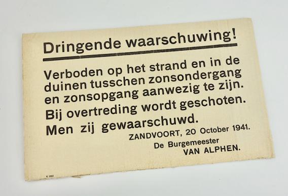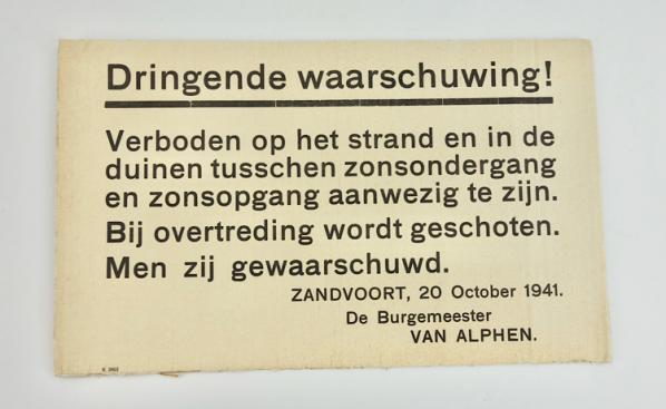 “Verboden op het strand en in de duinen tusschen zonsondergang en zonsopgang aanwezig te zijn. Bij overtreding wordt geschoten. Men zij gewaarschuwd”