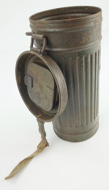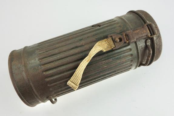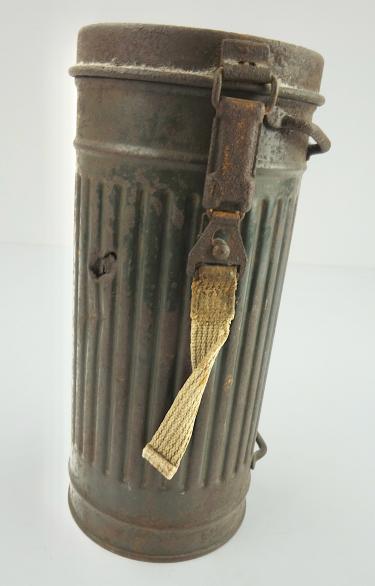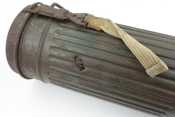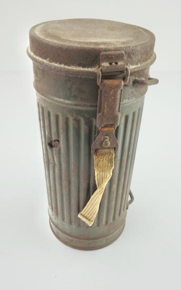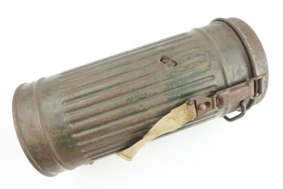 Wehrmacht M31 Gasmask Cannister Very nice combat relic Wehrmacht M31 gasmask cannister with shrapnel damage. In used but good condition.