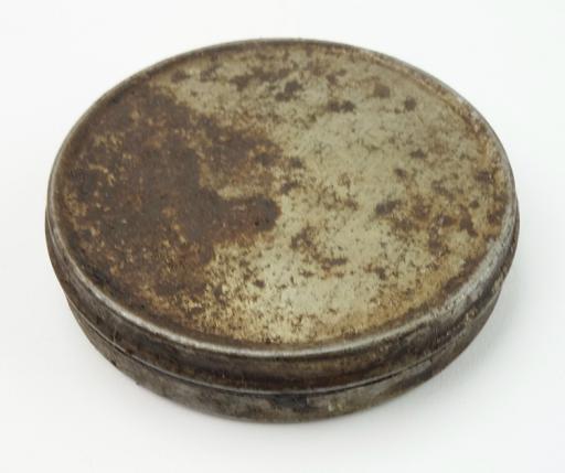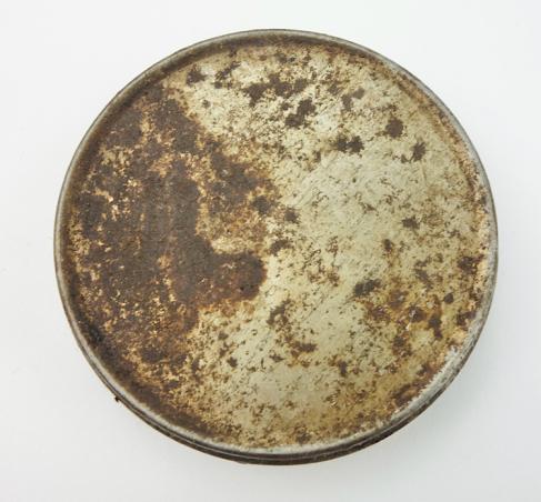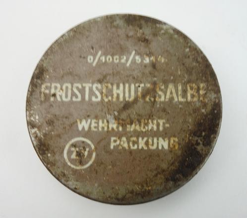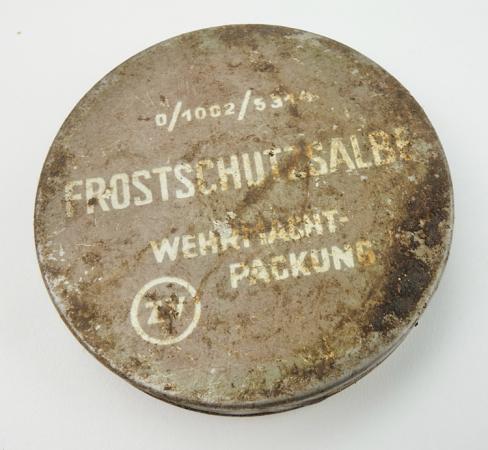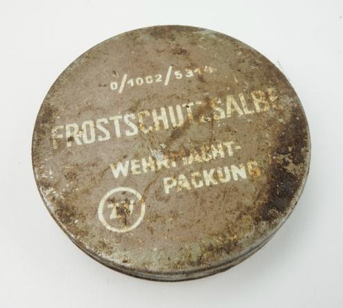 Nice original metal can Wehrmacht “Frostschutz Salbe” skin ointment to protect the skin against ice cold and freezing weather. Nicely marked “Wehrmacht Packung” nice used metal can with content in good condition.