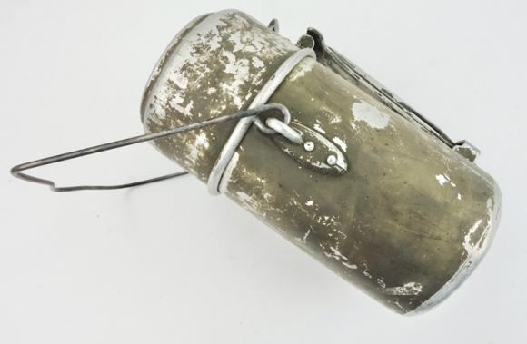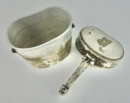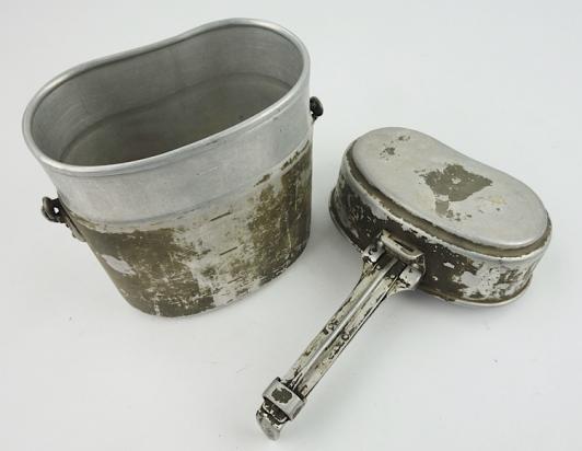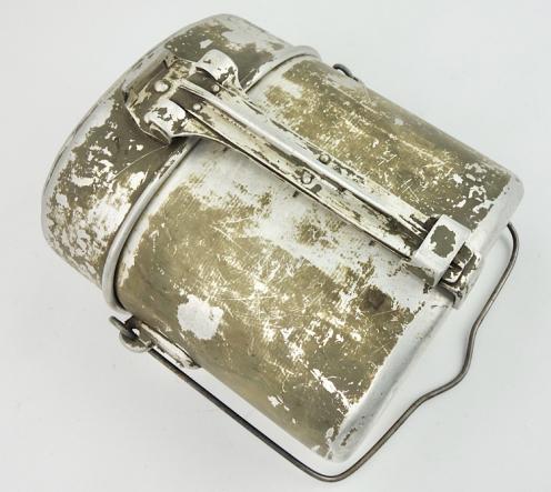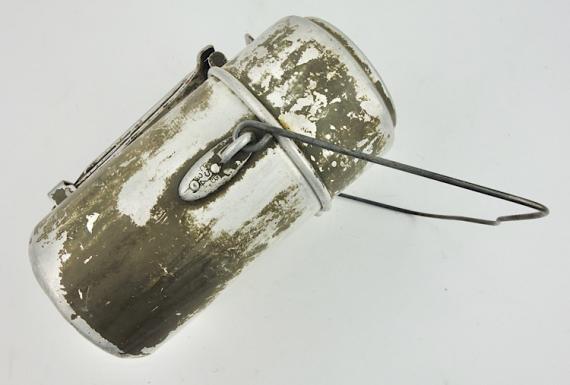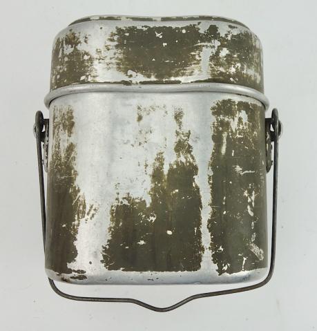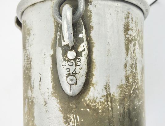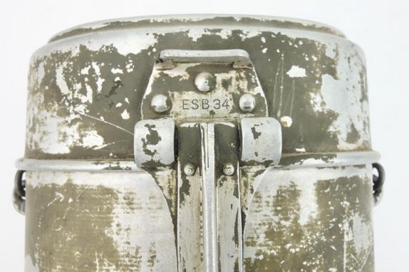Wehrmacht Early Mestin Nice used early Wehrmacht mestin Maker marked “ESB” and dated “1934” Aluminum made mestin with 50/60% of its original camo paint. In used but good condition.