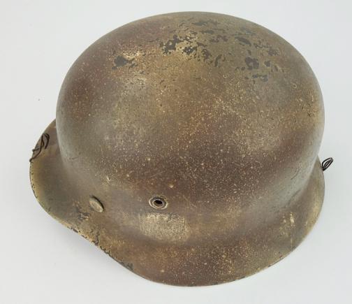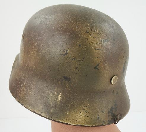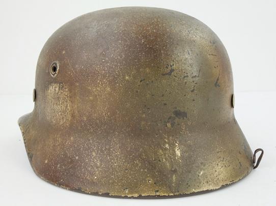 Nice used Wehrmacht M40 camo helmet maker code marked “Q” which is “Quist” in size “64” the helmet has 95% of its original three tone camo paint and has two original camo net attachment hooks.