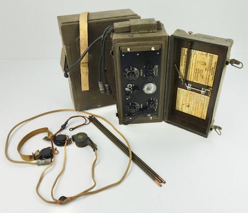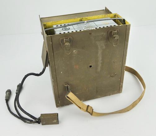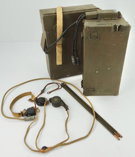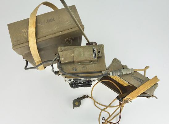The battery pack (with battery’s) would be worn on the shoulder cross straps and the strap on the pictures would be worn around the breast. The transmitter-receiver would be worn on the shoulder straps to at the front of the radio operator. The set is complete with its very rare to find headphones-microphone set. With Canadian broad arrow stamps.