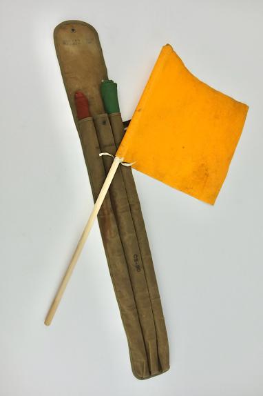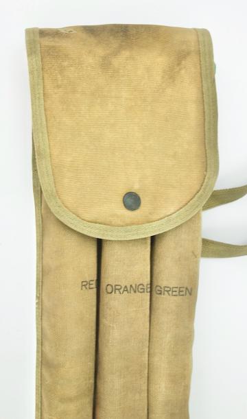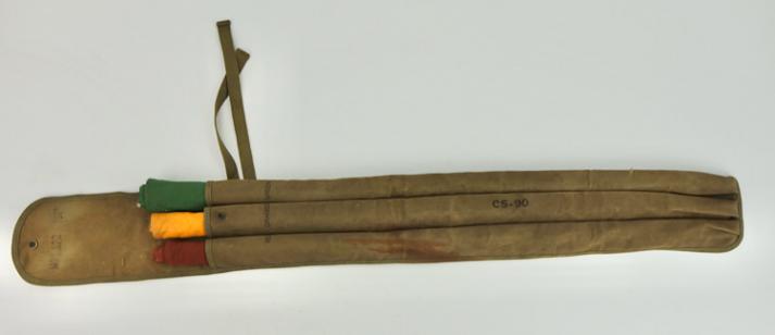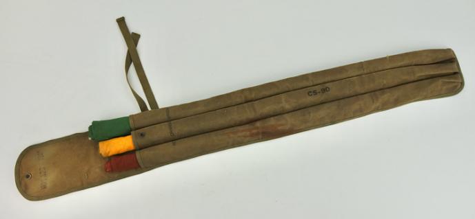 US WW2 CS-90 Signal Flags Nice used US WW2 CS-90 signal flags in original pouch. There are 3 Signal flags in the pouch Red, Orange and Green. Dated April “1937” In used but good condition,