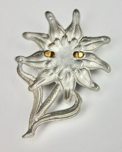Metal Gebirgsjäger Cap Edelweiss Very nice metal Gebirsjäger edelweiss Used on M43 caps. In very good condition.