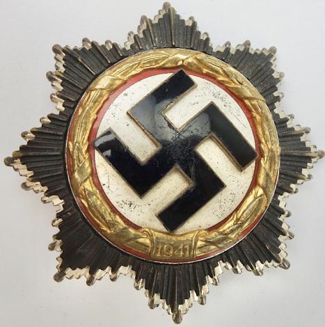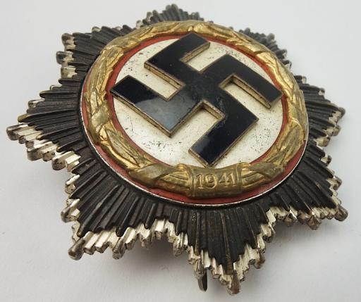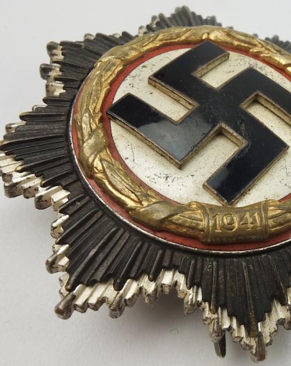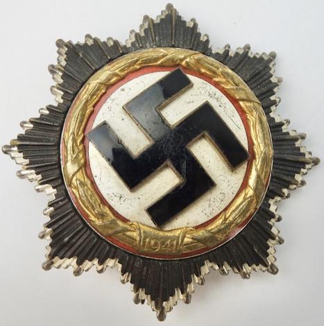 Nice used “Deutsches Kreutz in Gold” (German Cross in Gold the Third Reichs 3th Highest combat Award for bravery in combat. This nice used six rivet version is made by “Godet, Berlin” and marked on the inside needle with “Godet’s” maker code “21”