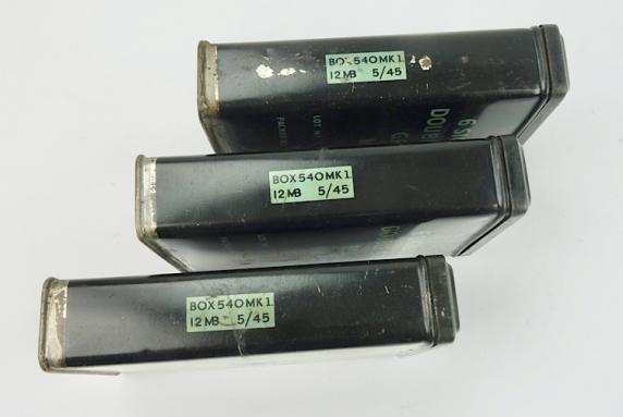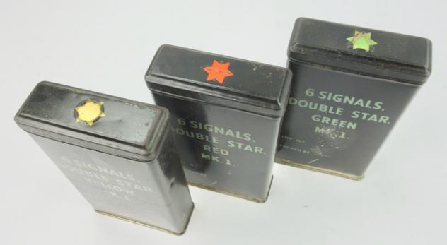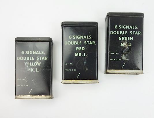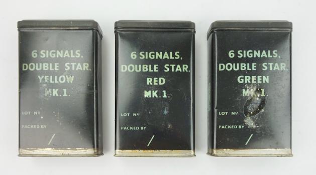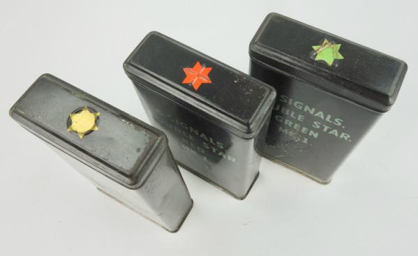 3 British WW2 Flare Containers One container for red flares, one for yellow flares, one for green flares 6 flares in every container, dated May 1945 In very good condition