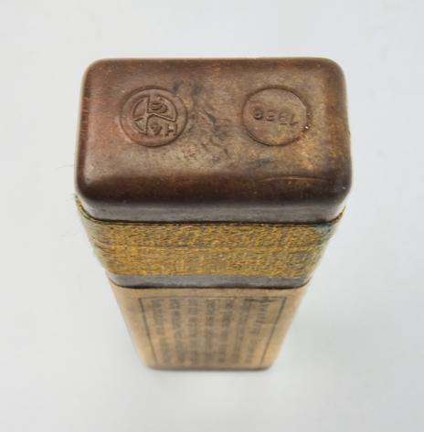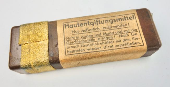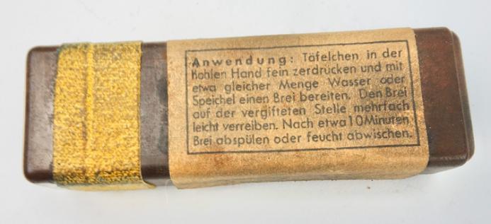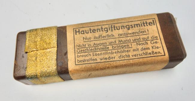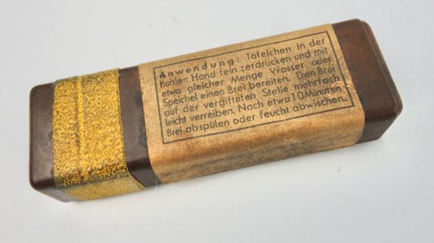 The box belongs in every Wehrmacht M31 gasmask cannister. The tablets where used to clean the skin after a poison gas attack. “Hautentgiftung”