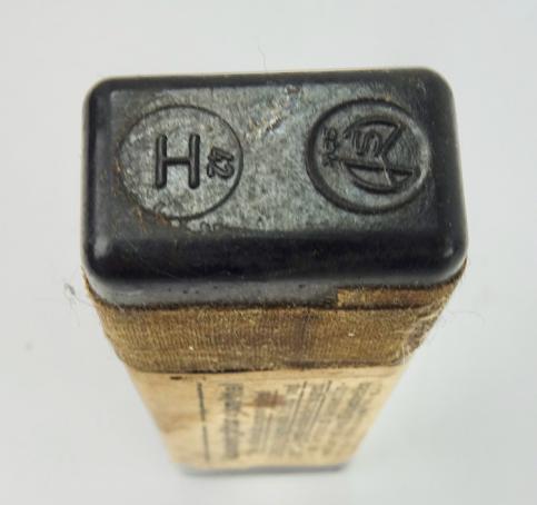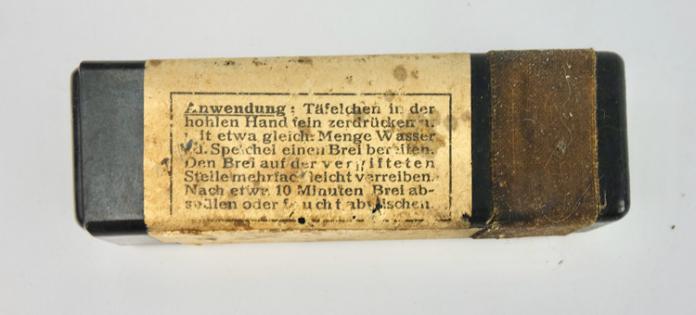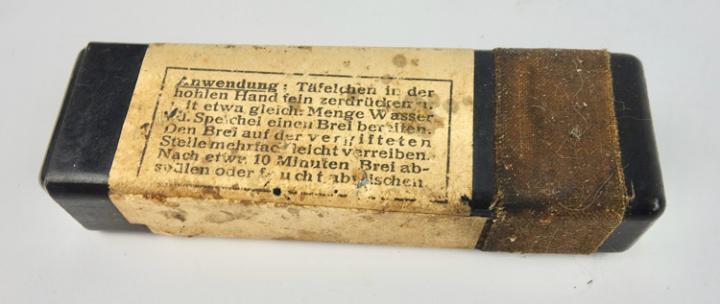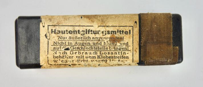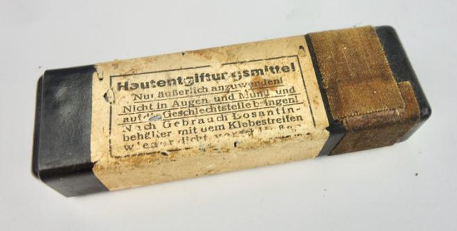 The box belongs in every Wehrmacht M31 gasmask cannister. The tablets where used to clean the skin after a poison gas attack. “Hautentgiftung”