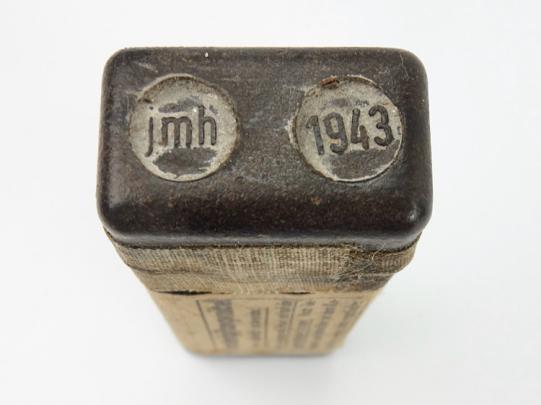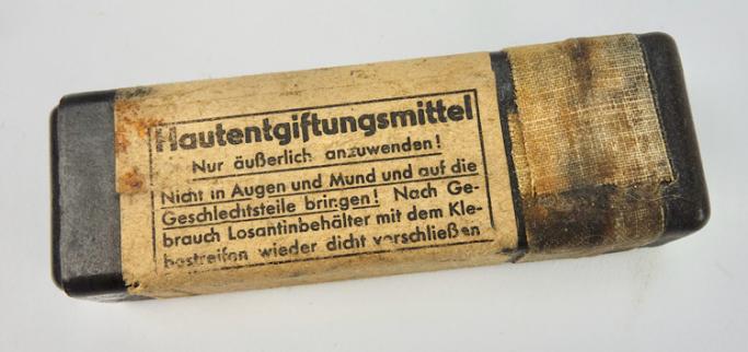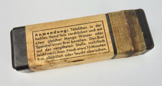 The box belongs in every Wehrmacht M31 gasmask cannister. The tablets where used to clean the skin after a poison gas attack. “Hautentgiftung”