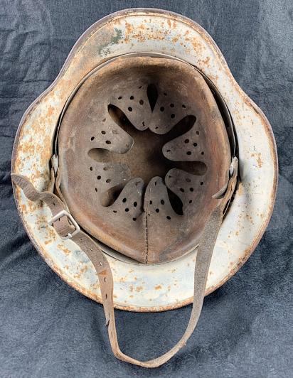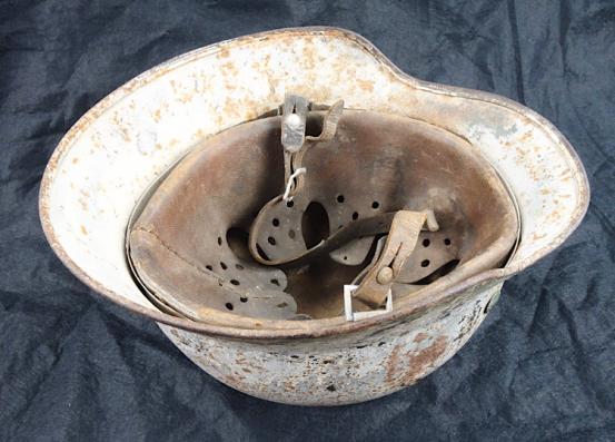 And complete with its original early leather combat helmet strap with aluminum liner. Fantastic untouched winter camo helmet with hand painted white winter camo. Hard to find!!!