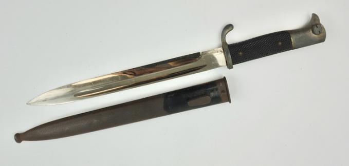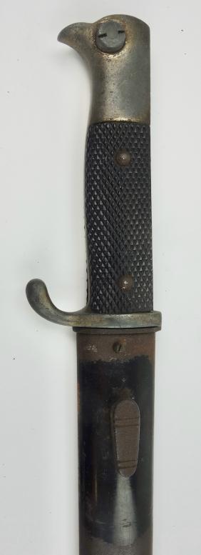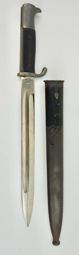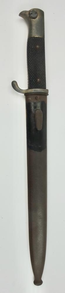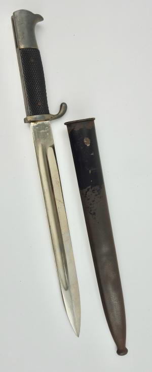 Wehrmacht Dress Bajonet Nice used Wehrmacht dress bajonet In its original metal scabbard Non maker marked. These bajonets where privately purchased by German soldiers. In used nut very good condition.