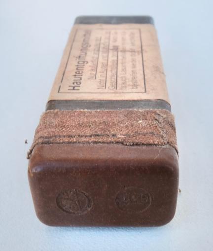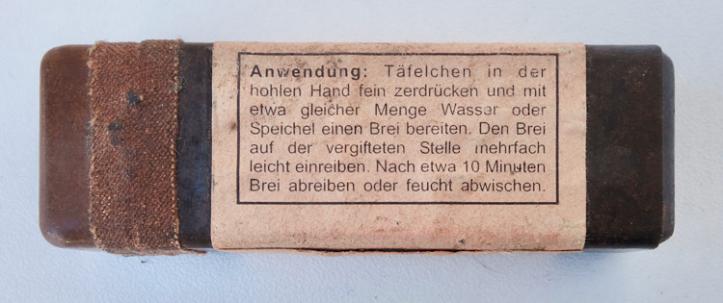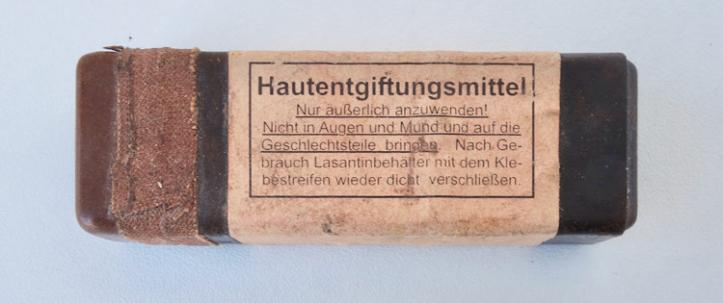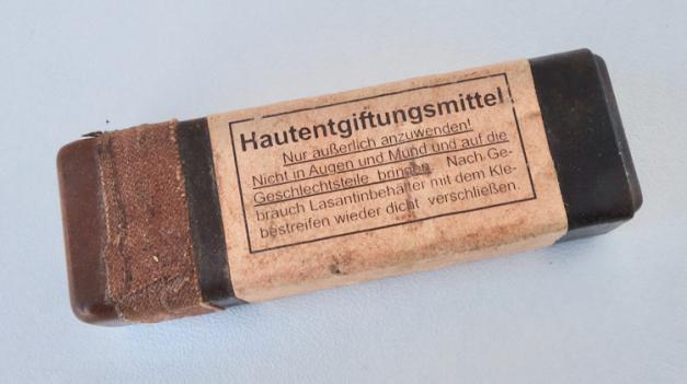 The box belongs in every Wehrmacht M31 gasmask cannister. The tablets where used to clean the skin after a poison gas attack. “Hautentgiftung”