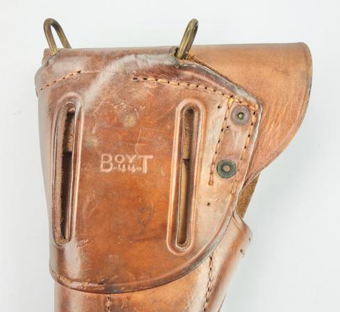 US WW2 M1911 Pistol Holster Very nice near mint leather US WW2 M1911 pistol holster for the Cal. 45 ACP M1911 Semi Automatic Pistol. Made by “Boyt” and dated “1944” Leather in very good and smooth condition.