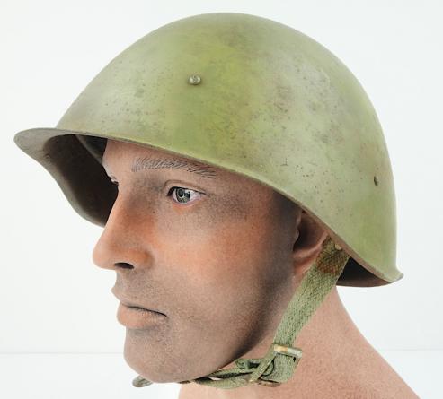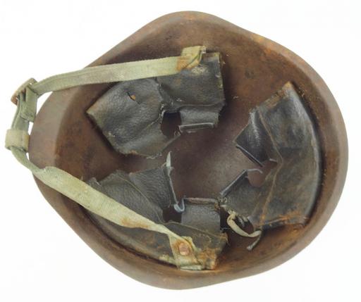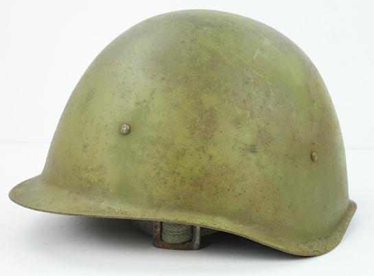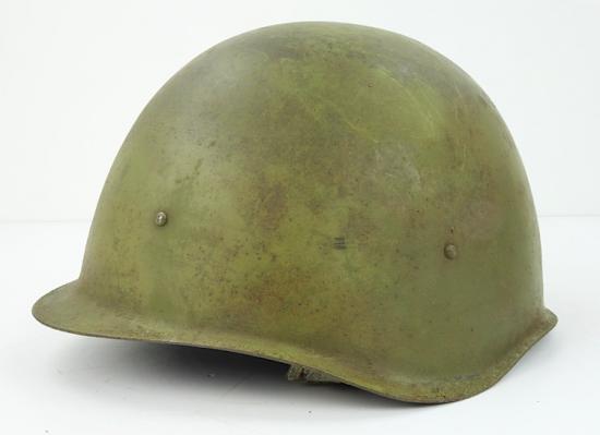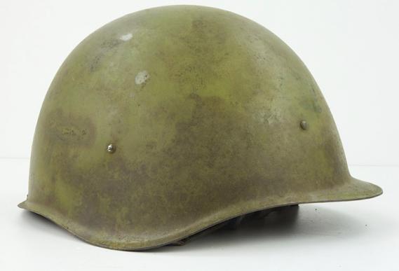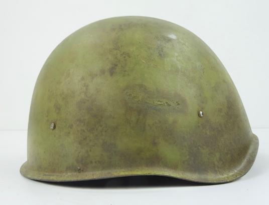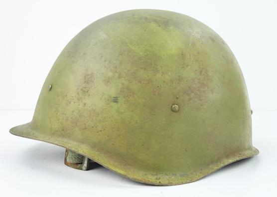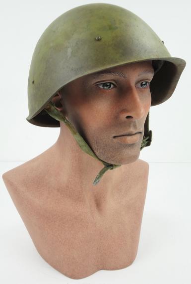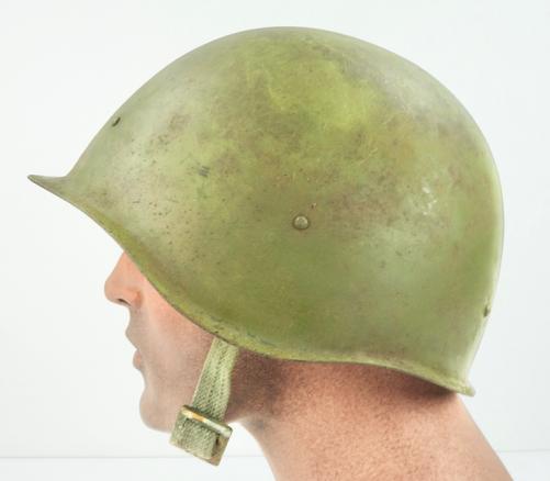 In 95% of its original WW2 typical soviet green camo paint. With its original liner and webbing combat helmet strap. In used but good condition.