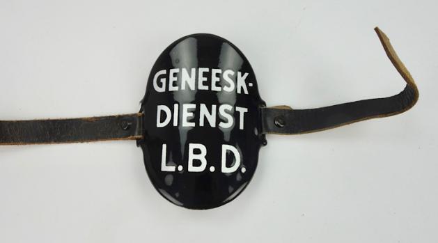 “Lucht Bescherming, Geneeskundige Dienst” with its original leather strap. In very good condition.