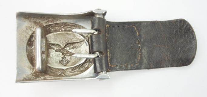 Early aluminum Luftwaffe belt buckle with leather tab, dated “1937 ” the leather tab is unit marked “H.Sch.E.